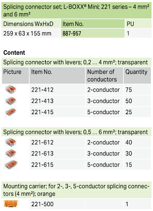 The 887-957 includes 2-conductor (221-412, 221-612), 3-conductor (221-413, 221-613), and 5-conductor (221-415, 221-615) connectors for flexible wiring configurations. It also includes comes with a 221-500 Mounting Carrier for professional, rail-mounted installation of 2-, 3-, and 5-wire connectors in control cabinets and distribution boxes.